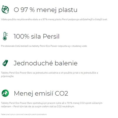Spoločnosť Henkel sa neustále snaží prinášať svojim spotrebiteľom pokrokové výrobné postupy a inovatívne produkty, no s veľkým dôrazom na trvalú udržateľnosť. Medzi takéto inovatívne produkty patrí aj prací prostriedok Persil Eco Power Bars.